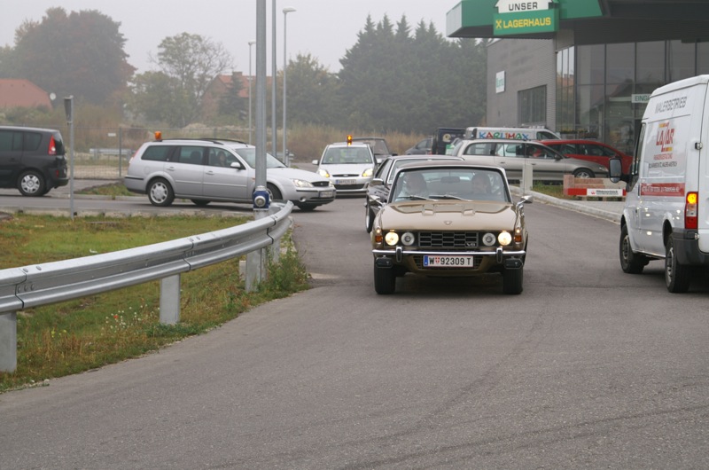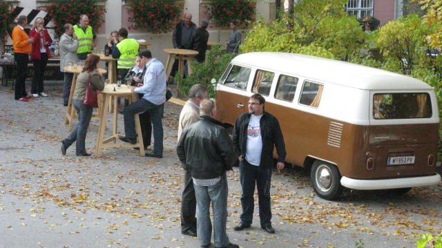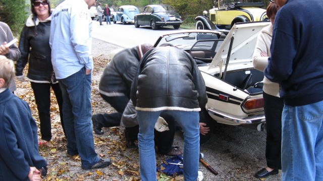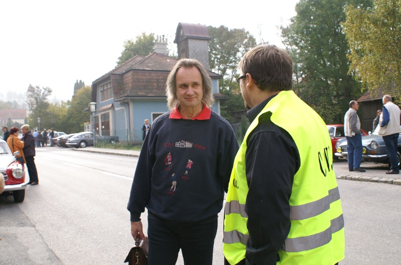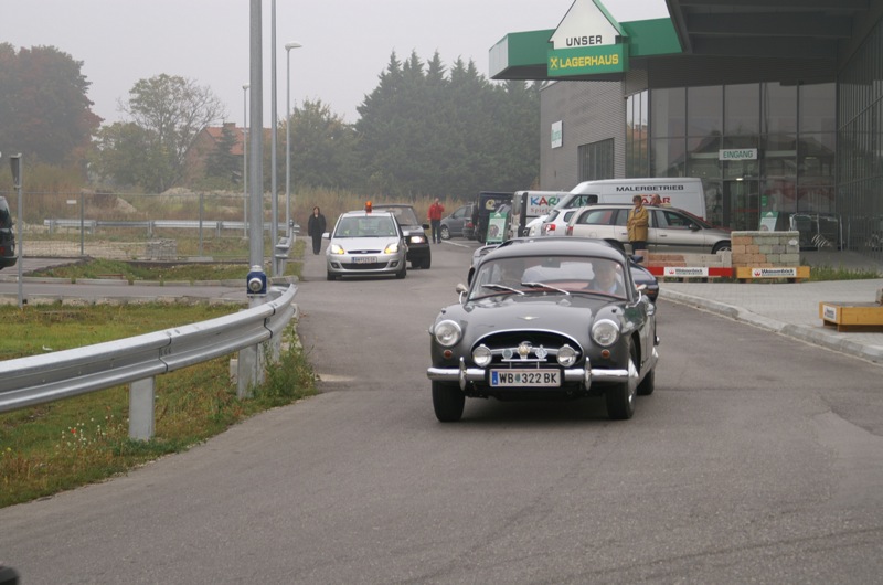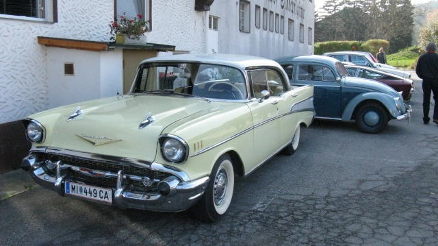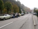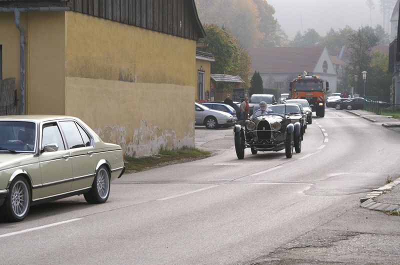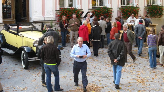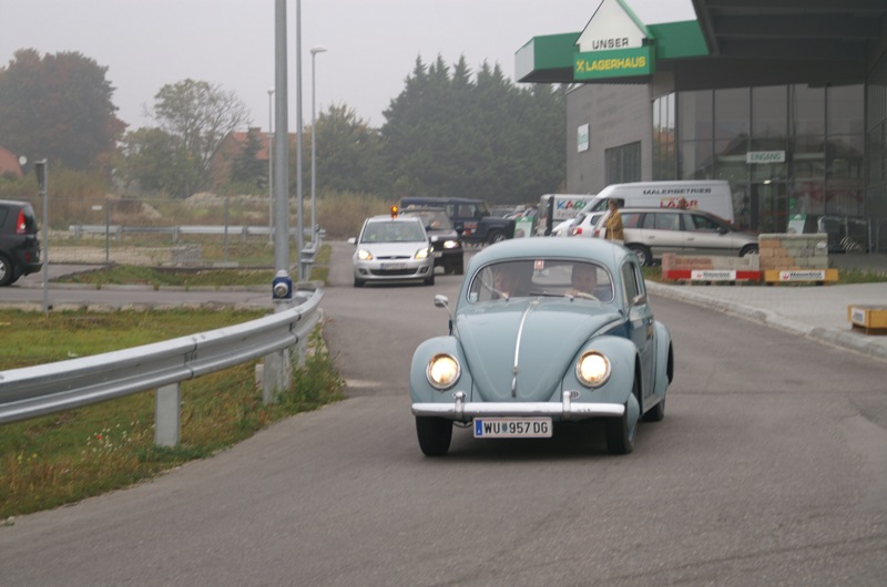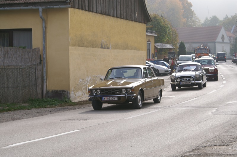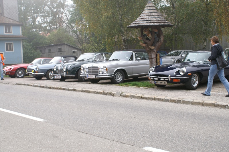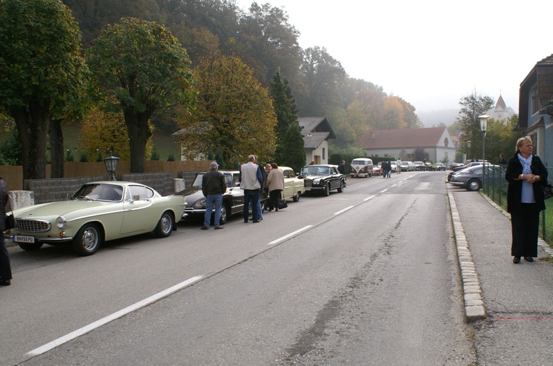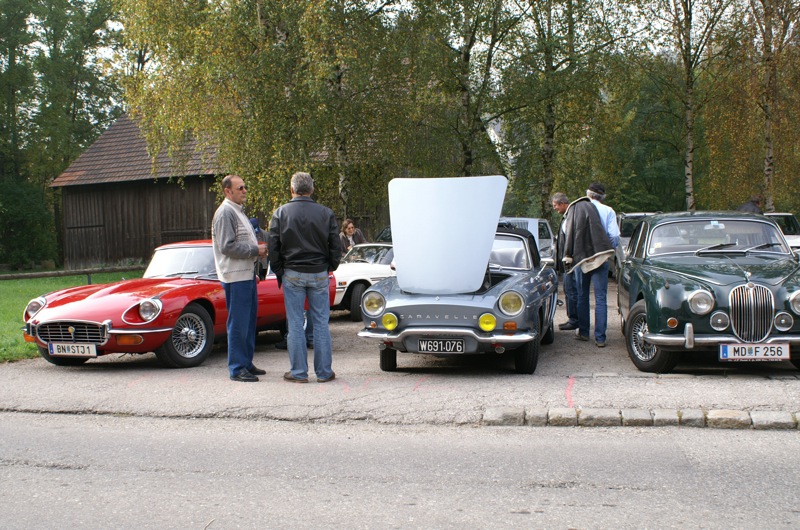 Mit etwas Verspätung weiter über die Klammhöhe, vorbei bei St. Corona am Schöpfl über Klein Mariazell, weiter nach Weißenbach, ins Triestingtaler Museum. Einige der Teilnehmer nutzten das tolle Wetter und beschlossen eine größere Runde als geplant zu fahren. Dass man sich so großmächtig verfahren hatte, spielte jedoch keine Rolle. Es hieß ja „Fahrt durch den Wienerwald“. Der Nebel hatte sich gelichtet und so konnte man das leuchtend bunte Farbenspiel der sich herbstlich färbenden Blätter bewundern. Leider stoppte eine Panne den Konvoi. Bei einem Fahrzeug waren alle Schrauben des Radlagers locker. Unter fachkundiger Beratung vieler Teilnehmer wurde der Schaden behoben und die Fahrt ging ohne weitere Zwischenfälle weiter.