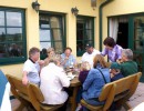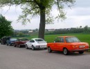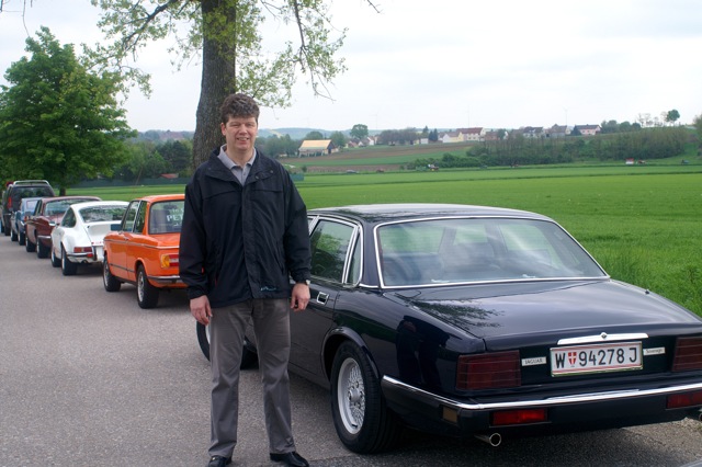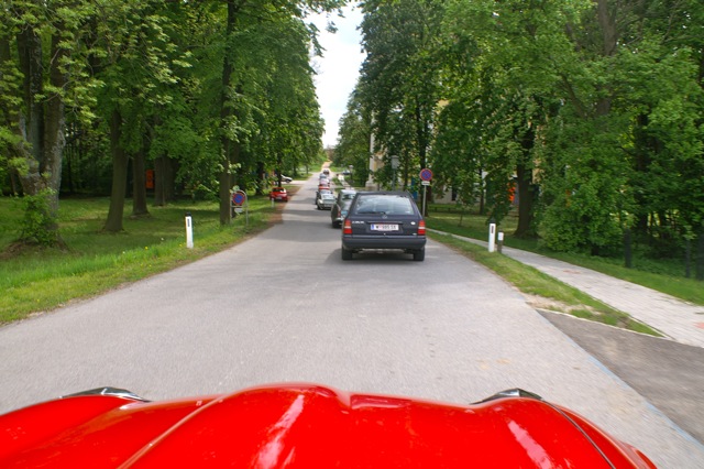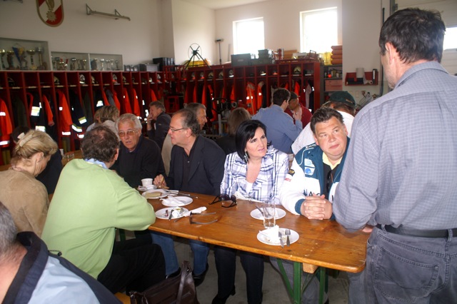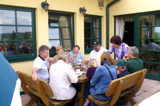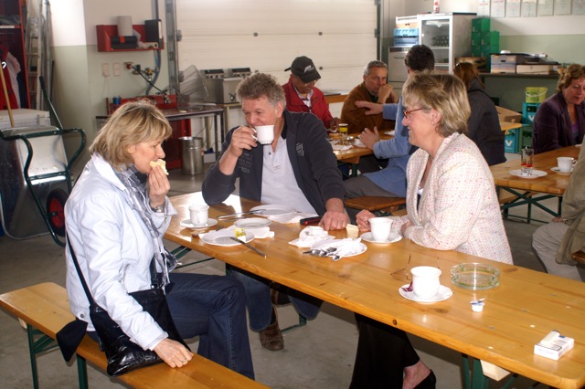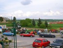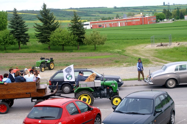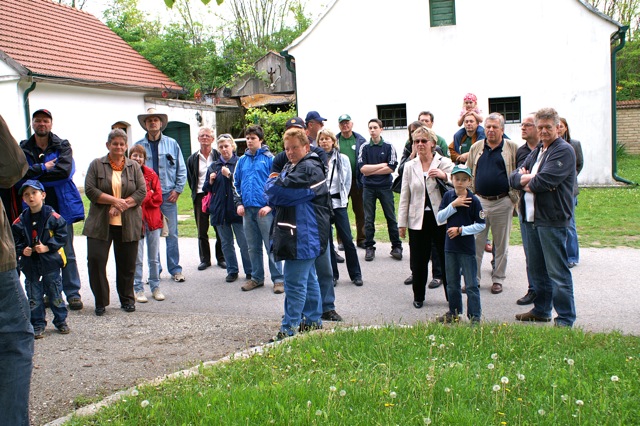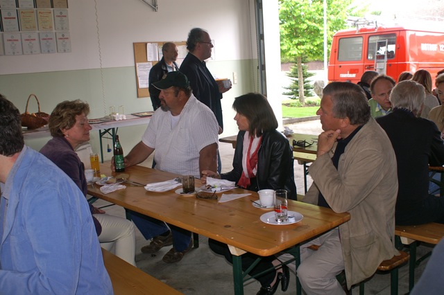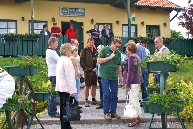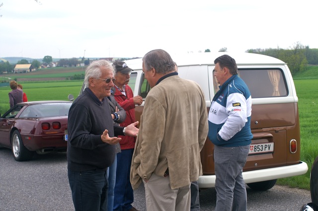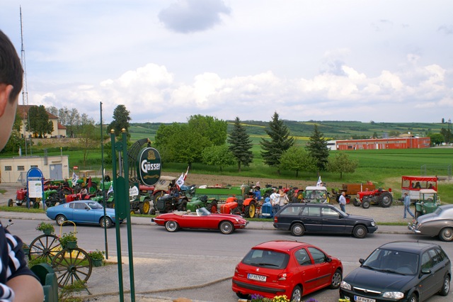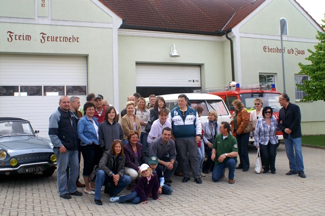 Unterstützt wurde er durch Herrn Fritz, ein Freund der Familie Rosner. Rund 14 Fahrzeuge verschiedenster Baujahre (unser lieber Walter… :-)) machten sich auf den Weg nach Ebersdorf zur Freiwilligen Feuerwehr. Dort wartete bereits ein Frühstück, welches nach der langen Anfahrt (ca. 3-4 km) dringend notwendig war. Nach dieser Stärkung Weiterfahrt durch die Rapsfelder nach Poysdorf zum Mittagessen. Einigen nutzten die Mittagsrast zu einem Bad in der Sonne. Gestärkt ging es nun wieder zurück, einer Einladung folgend, nach St. Ulrich. Dort trafen wir mit dem ansässigen Oldtimerclub Bullendorf auf Kaffee zusammen. Wir konnten ihre Oldtimer und Oldtimer-Traktoren bewundern. Nach Kaffee und Kuchen ging’s zur letzten Etappe nach Bullendorf. Nach einem kurzen Spaziergang in die Kellergasse des kleinen Weinortes erklärte uns Herr Wiesinger die Entstehungsgeschichte des Weinviertels. Wir konnten einen Weinkeller besuchen der liebvoll arrangiert war. Das Ende fand beim Heurigen statt.
