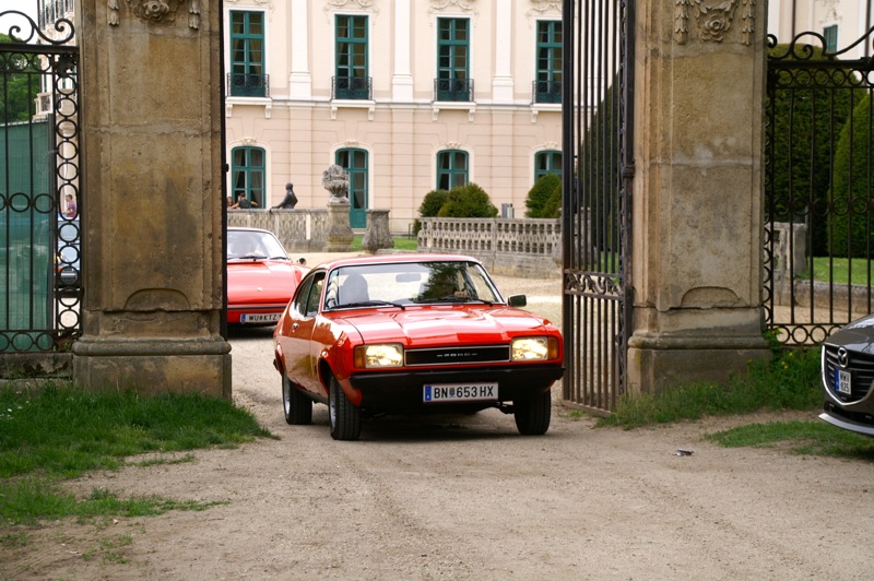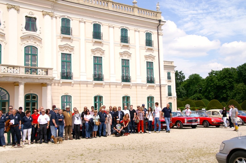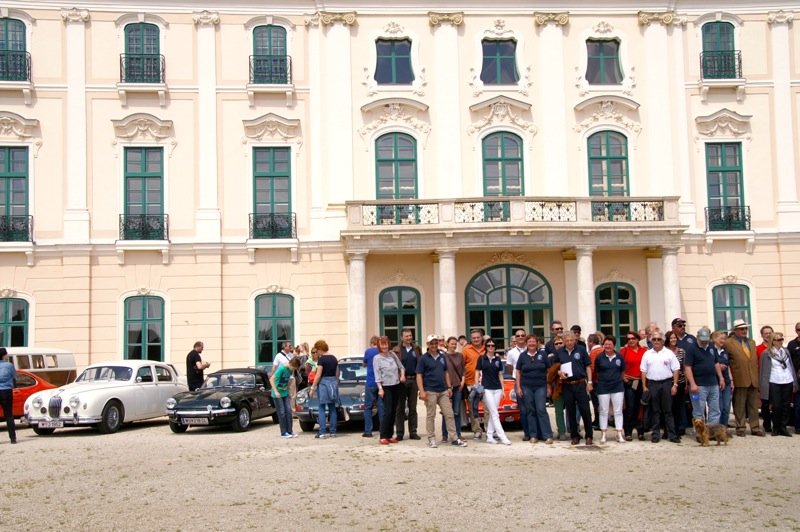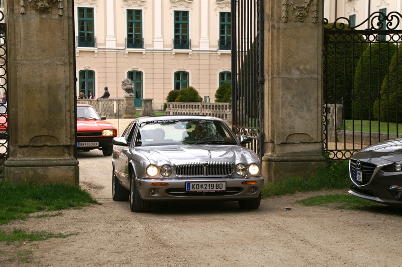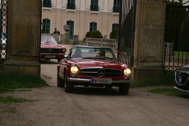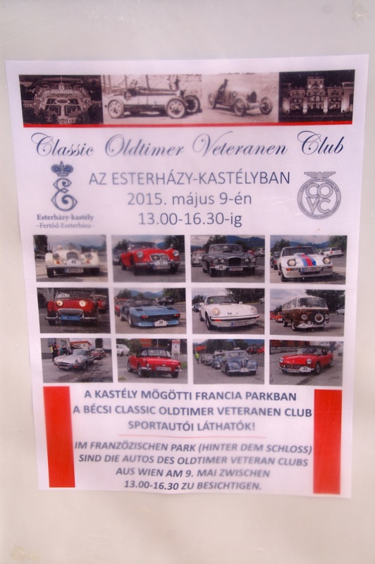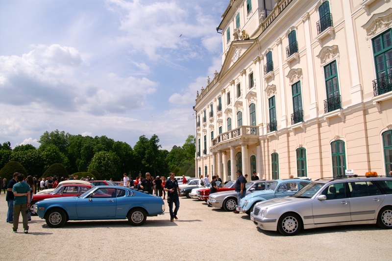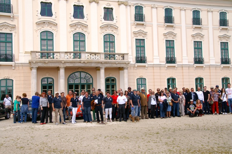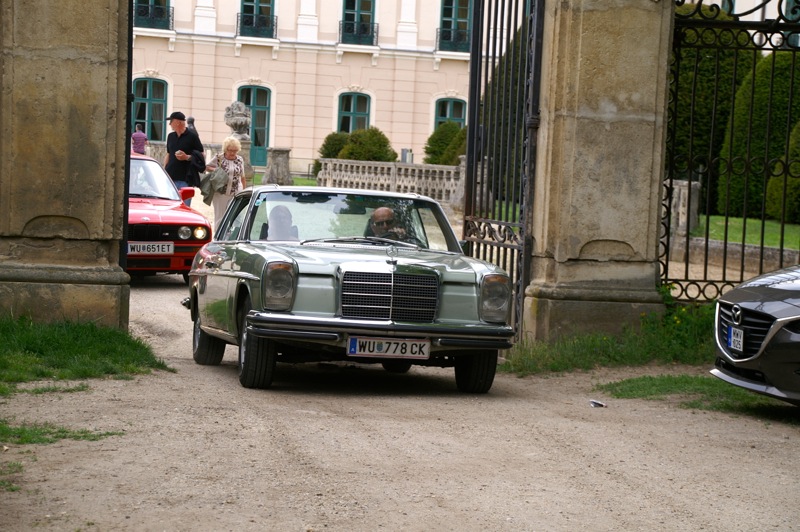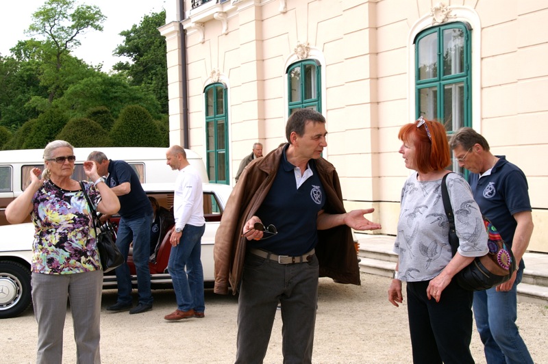 Außergewöhnlicher, weil unbekannter (?) Treffpunkt für den Saisonstart 2015 war diesmal -die Panoramaschenke. Unser „Apothekermeister“ Heinz und seine charmante Gattin Maria, eröffneten die Ausfahrt mit einer Rätselrallye. Welche Ampel soll ich abbiegen? Sag, da wievielte Kreisverkehr war das jetzt? Nach Norden oder Süden, ich weiß es nicht mehr genau. Ganz egal, vor mir fährt Hans Juster, der wird es ja wissen – oder doch nicht? 🙂 Letztendlich fanden trotzdem alle 35 Fahrzeuge den richtigen Weg..Unsere Route führt uns zunächst über das Leithagebirge zum Seebad Rust, wo wir im „Katamaran“ eine kurze Kaffeepause einlegten. Dann umrunden wir den Neusiedler See, vorbei an Sopron und Balf, um zum Lustschloss der Fürsten Esterházy in Fertőd zu gelangen. Wo wir im Park des Schlosses Esterhazy unsere geliebten Oldtimer ausstellungsgerecht für alle Besucher und Fotografen positionieren durften. Angekündigt durch einen gestalteten Plakataufsteller des ortsansässigen Fremdenverkehrsvereines, nützen auch viele Besucher diese Möglichkeit. Nach der persönlichen Begrüßung durch Fürst Anton II. Esterházy, dem Oberhaupt der Familie Esterházy de Galántha, ging es zum Mittagessen in das Restaurant Granatos. Schloss Esterhazy, da wird es doch irgendwo eine Esterhazy-Schnitte geben?! Dachte sich zumindest „Hansi“, aber leider war dem nicht so. Gottseidank gab es aber Somlauer Nockerln. Gestärkt nützen die meisten Teilnehmer die Zeit für eine Führung durch das Schlossmuseum mit teilweise eindrucksvollen Exponaten. Am späteren Nachmittag brachen wir zu unserer letzten Etappe, wie kann es anders sein, zum Abschlussheurigen nach Mönchhof, auf. Vorbei am größten Windpark Mitteleuropas und die weiten Weingärten entlang der Seewinkel Weinstraße. In Mönchhof kehrten wir beim Heurigen Schlossahaus ein und zum Abschluss bekam Otto vom Präsidenten des BMW02 Club Austria ein kleines Dankeschön in Form eines Modellautos – natürlich ein BMW 2002. Eine wirklich nette Geste und auch das erste Mal, dass sich ein Gast eines anderen Clubs so bedankt hat.