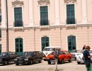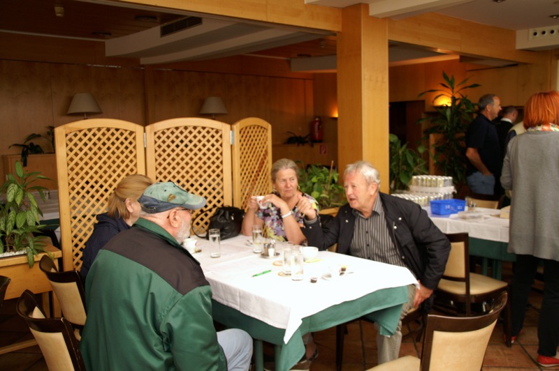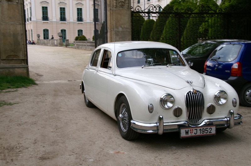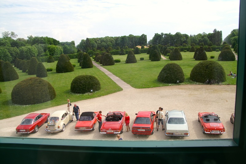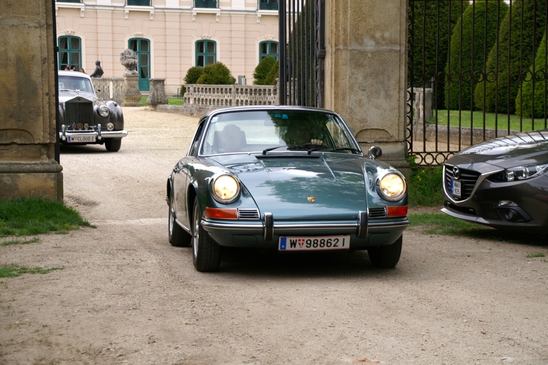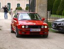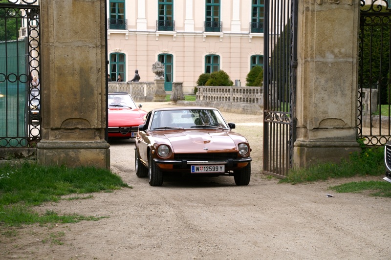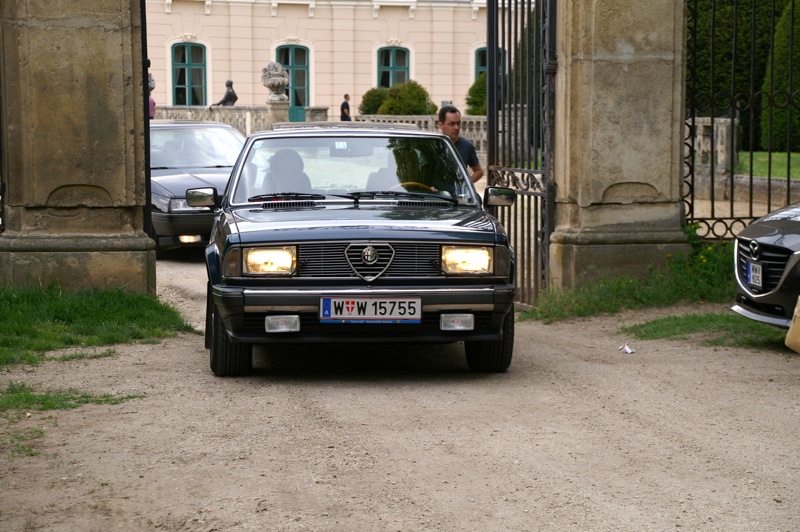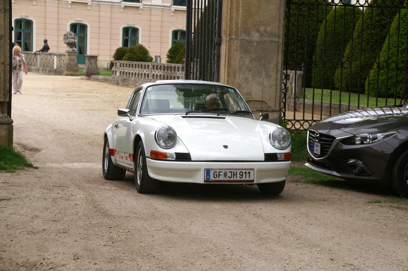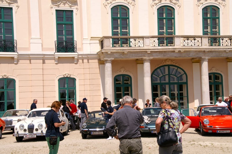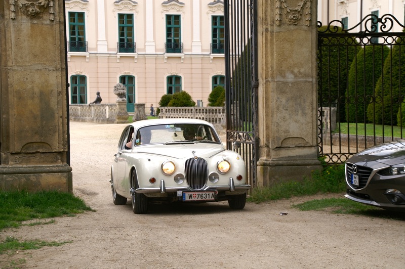 Außergewöhnlicher, weil unbekannter (?) Treffpunkt für den Saisonstart 2015 war diesmal -die Panoramaschenke. Unser „Apothekermeister“ Heinz und seine charmante Gattin Maria, eröffneten die Ausfahrt mit einer Rätselrallye. Welche Ampel soll ich abbiegen? Sag, da wievielte Kreisverkehr war das jetzt? Nach Norden oder Süden, ich weiß es nicht mehr genau. Ganz egal, vor mir fährt Hans Juster, der wird es ja wissen – oder doch nicht? 🙂 Letztendlich fanden trotzdem alle 35 Fahrzeuge den richtigen Weg..Unsere Route führt uns zunächst über das Leithagebirge zum Seebad Rust, wo wir im „Katamaran“ eine kurze Kaffeepause einlegten. Dann umrunden wir den Neusiedler See, vorbei an Sopron und Balf, um zum Lustschloss der Fürsten Esterházy in Fertőd zu gelangen. Wo wir im Park des Schlosses Esterhazy unsere geliebten Oldtimer ausstellungsgerecht für alle Besucher und Fotografen positionieren durften. Angekündigt durch einen gestalteten Plakataufsteller des ortsansässigen Fremdenverkehrsvereines, nützen auch viele Besucher diese Möglichkeit. Nach der persönlichen Begrüßung durch Fürst Anton II. Esterházy, dem Oberhaupt der Familie Esterházy de Galántha, ging es zum Mittagessen in das Restaurant Granatos. Schloss Esterhazy, da wird es doch irgendwo eine Esterhazy-Schnitte geben?! Dachte sich zumindest „Hansi“, aber leider war dem nicht so. Gottseidank gab es aber Somlauer Nockerln. Gestärkt nützen die meisten Teilnehmer die Zeit für eine Führung durch das Schlossmuseum mit teilweise eindrucksvollen Exponaten. Am späteren Nachmittag brachen wir zu unserer letzten Etappe, wie kann es anders sein, zum Abschlussheurigen nach Mönchhof, auf. Vorbei am größten Windpark Mitteleuropas und die weiten Weingärten entlang der Seewinkel Weinstraße. In Mönchhof kehrten wir beim Heurigen Schlossahaus ein und zum Abschluss bekam Otto vom Präsidenten des BMW02 Club Austria ein kleines Dankeschön in Form eines Modellautos – natürlich ein BMW 2002. Eine wirklich nette Geste und auch das erste Mal, dass sich ein Gast eines anderen Clubs so bedankt hat.