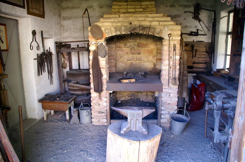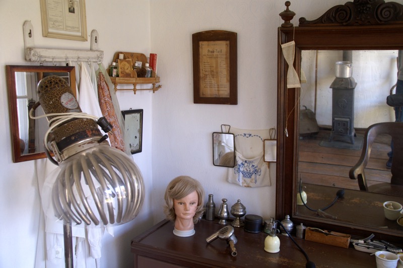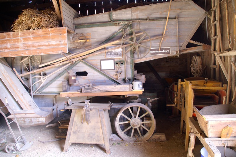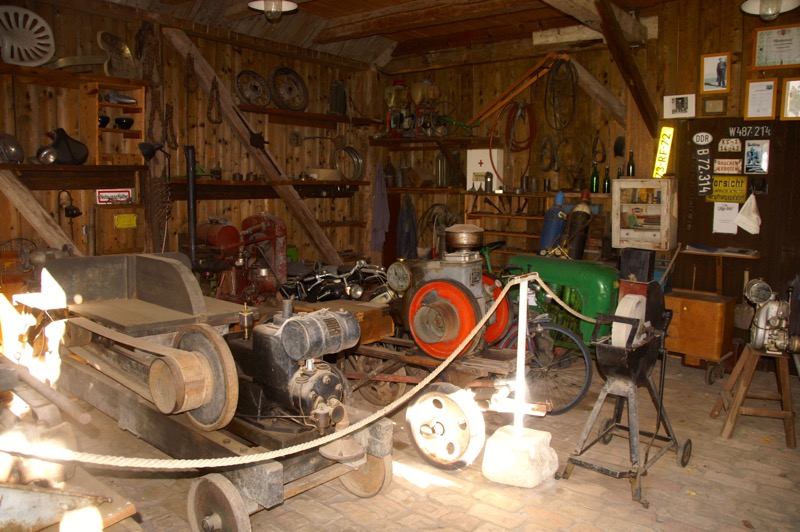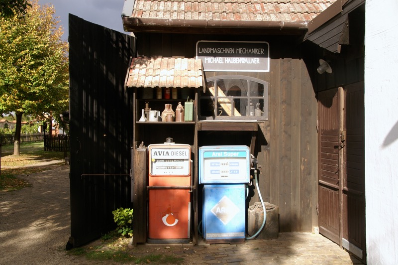 Das Dorfmuseum ist in drei Bereiche gegliedert. Im ersten geht es um die Grundlagen der Existenzsicherung – vom Getreidebau bis hin zur Rübenwirtschaft, im zweiten um die Bevorratung für den Eigenbedarf. Hinter einem kleinen Teich liegt der dritte Teil, das idealtypische Dorf mit allem, was einstmals so dazugehörte – Anger und Teich, Gasthaus, Schule, Kino, Gemeindeamt, Feuerwehr, Werkstätten der Handwerker, Geschäfte, Milchhaus, Schrotmühle… und sogar eine Kirche, leicht erhöht auf einem Hügel und über allem thronend.