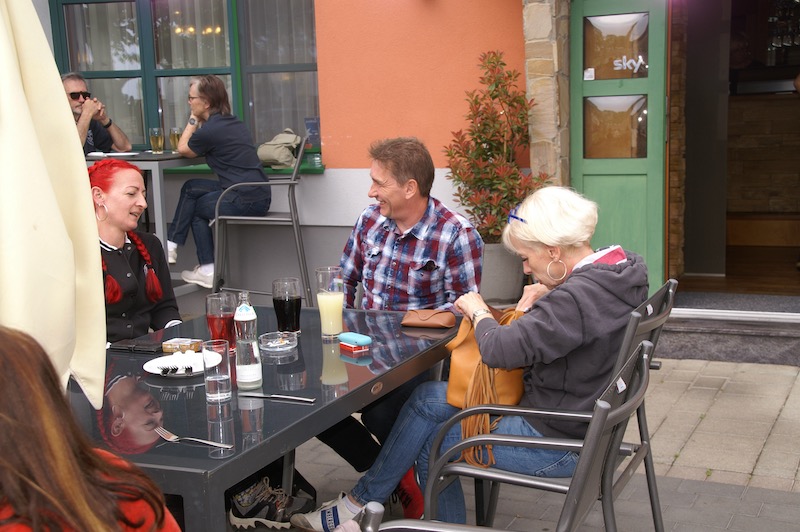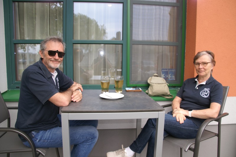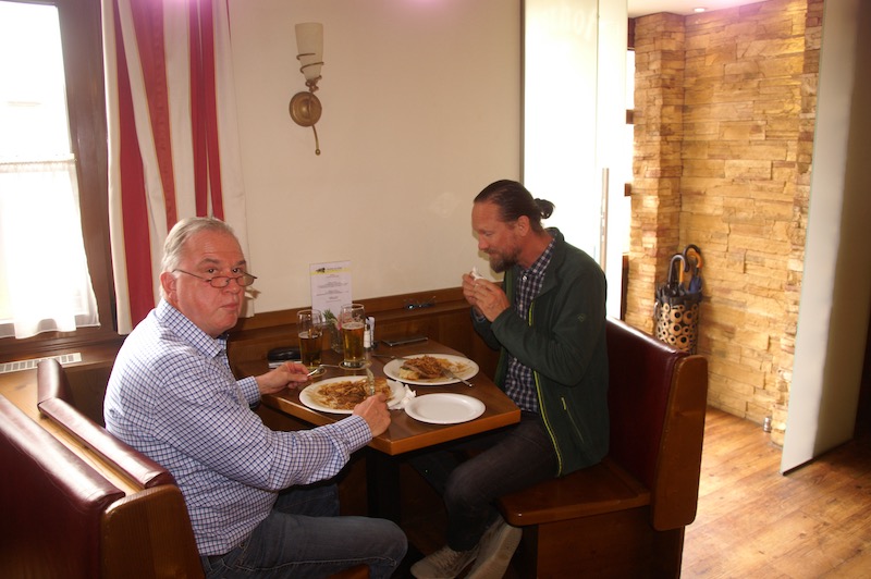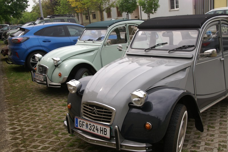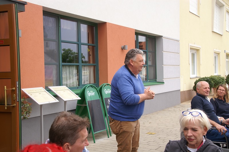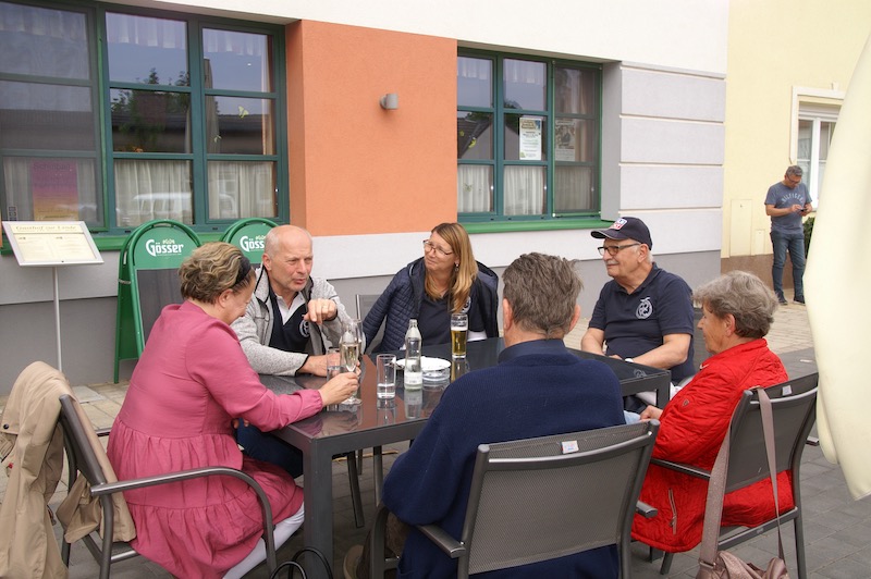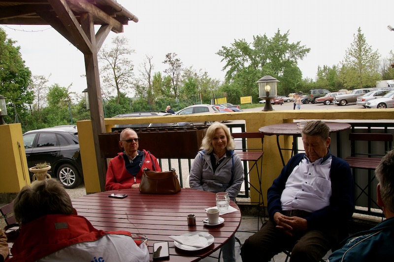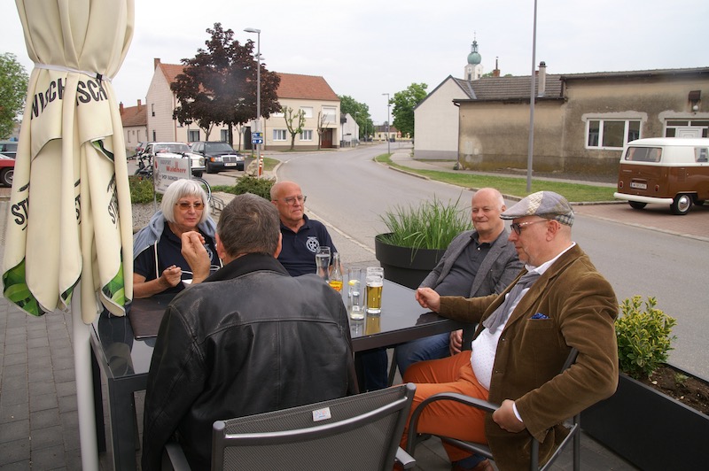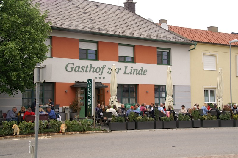 Am Weg durch das schöne Burgenland hat sich das Wetter soweit gemausert, dass der hitzige Wolfgang in seinem E-Type offen fahren konnte, beneidenswert. Wir haben das Outlet Center Parndorf, das wir aus der Vorweihnachtszeit gut kennen, links liegen lassen, einen Super-plus-Benzinpreis von 2,08 Euro notiert, und sind schließlich über Neusiedl am See, Weiden, Gols und Frauenkirchen nach St. Andrä gelangt, wo wir im „Restaurant zur Linde“ im Freien sehr gemütlich und gut gegessen haben. Wir haben Gespräche über meinen hitzegeschädigten Zylinderkopf im Zweit-Oldtimer, den Ukraine-Krieg Irrsinn und die Vorfreude auf unser privilegiertes Nachmittagsprogramm geführt, während wir drei Gänge verdrückt haben.