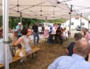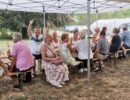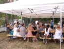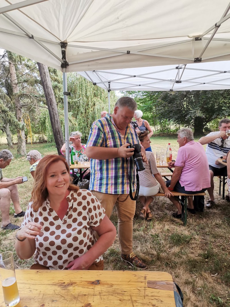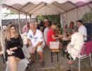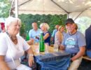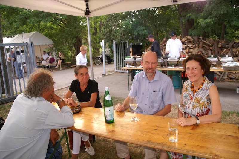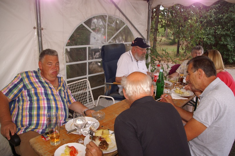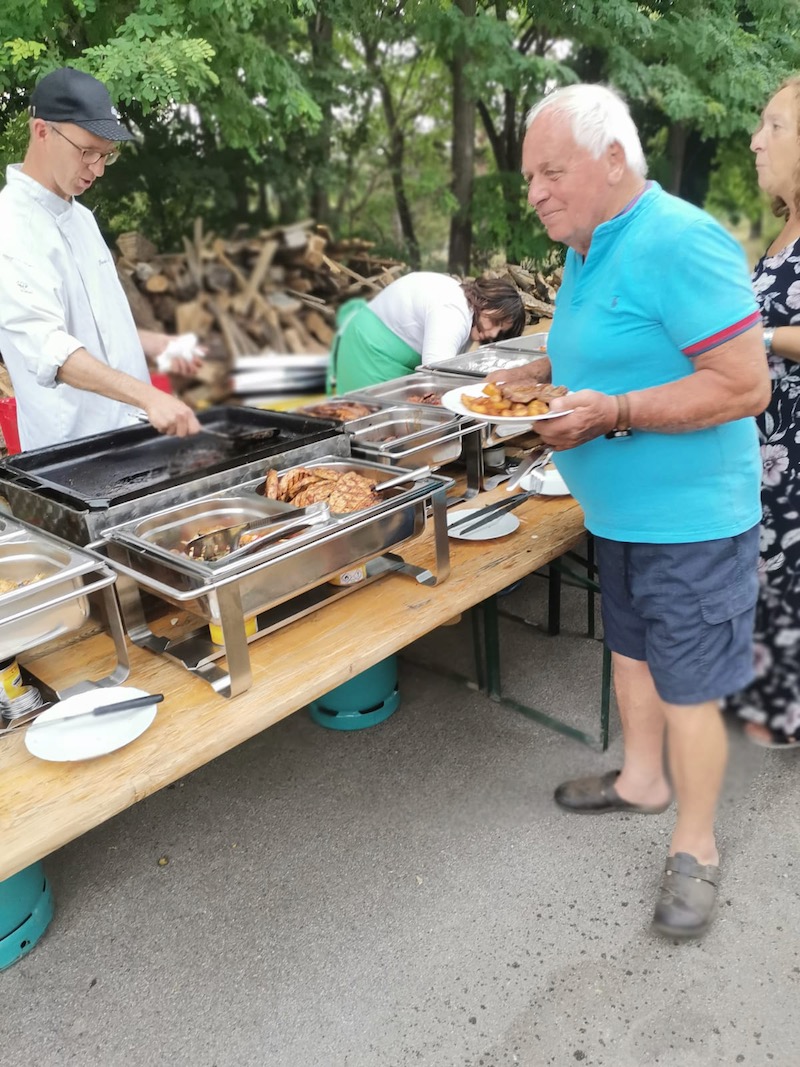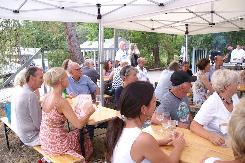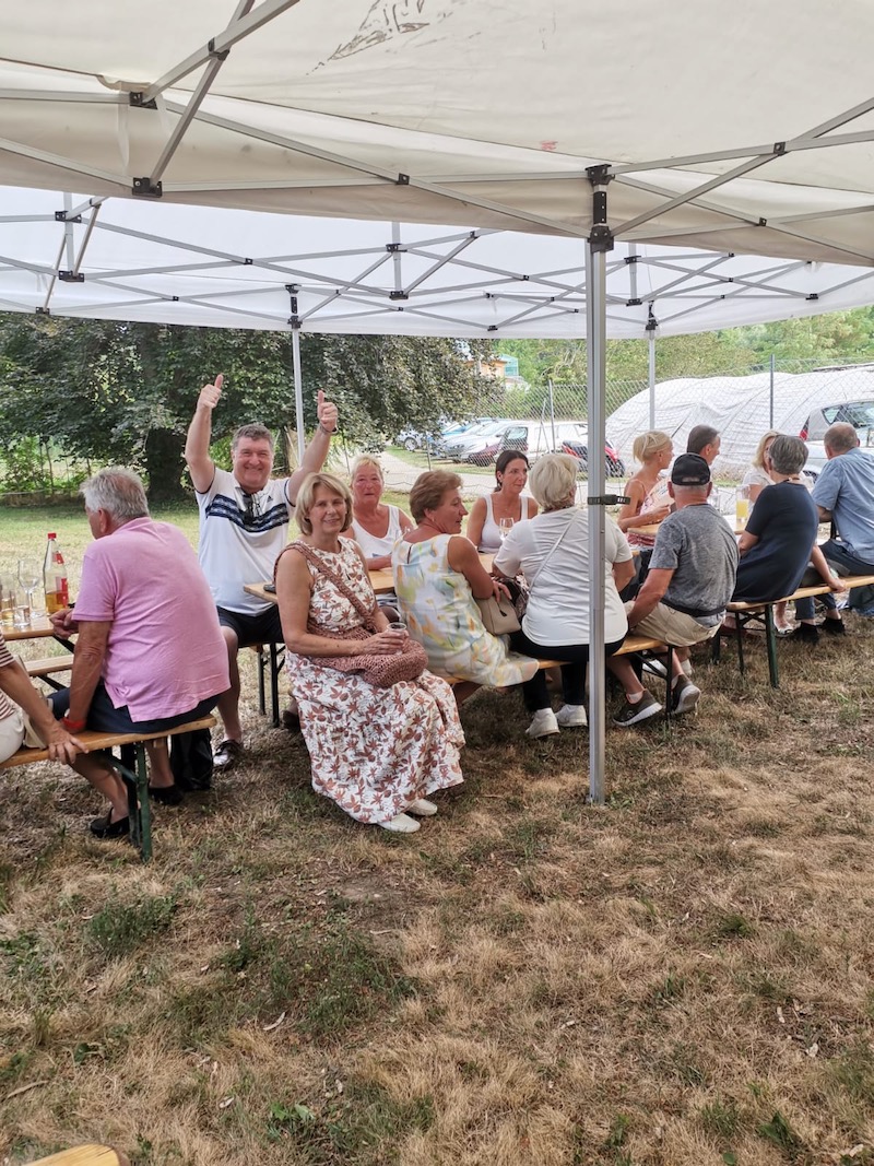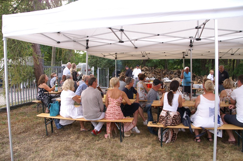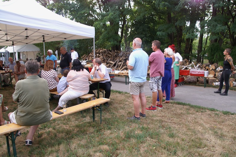 Alle Jahre wieder – Manfred Ebner und der COVC luden zu einem Sommerfest. Der berühmt berüchtigte Platz in der Lobau bot Platz und rund 70 Mitglieder. Freunde und geladene Gäste folgten, trotz 37 Grad, der Einladung. Es gab auch einige Überraschungen: erstmals konnten wir in Manfreds Garten unter Zelten sitzen. Das Catering von Fleischerei Wild war malerisch vor einem Holzstoß aufgebaut, noch wichtiger mit genügend Platz für die „Raubtierfütterung“😅. Es war für jeden Geschmack etwas dabei. Neben frisch zubereitenden Speisen samt Beilagen wurden wir mit Salaten und diversen Soßen verwöhnt. Vitamine sind wichtig!