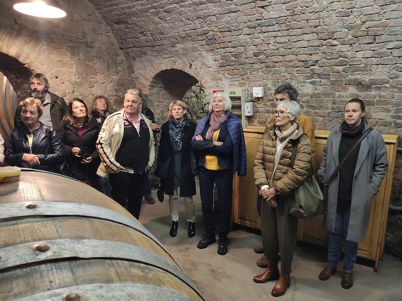 Danach spazierten wir in die heiligen Kellergewölbe – dort wo die Holzfässer mit besonders gereiftem Inhalt lagern und auch Hochzeiten gefeiert werden. Nach der Besichtigung kam der nicht unwichtige 2te Teil dieses Nachmittags – die Weinverkostung. Uns wurden 6 edle Weinsorten kredenzt – mit Weißbrotbegleitung. Da wir -mehr oder weniger – fachkundige Freizeit Sommeliers sind haben wir relativ rasch, und erstaunlicherweise immer einstimmig erraten, ob es ein „Roter“ oder doch ein „Weißer“ ist !! Wie auch immer – jede(r) hat dabei sein/ihr Lieblingströpferl gefunden und die Stimmung wurde von Kostprobe zu Kostprobe launiger. Was uns allen erstaunt hat ist die Vielfalt der Weine.